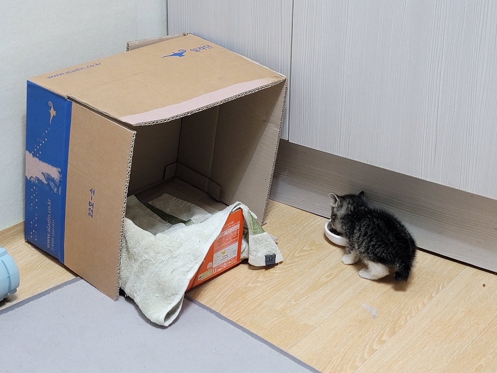 고양이가 생기니 좁은 집이 더 좁아졌다. 거실 한켠을 내주어야 했다. 거실도 거의 없어 싱크대가 있는 주변을 정리하고 박스로 임시 집을 만들었다. 첫날은 거의 먹지 않더니 이틀째가 되니 밥을 먹기 시작한다. 첫날 저녁에 마트에 가서 새끼 밥을 사 왔다.